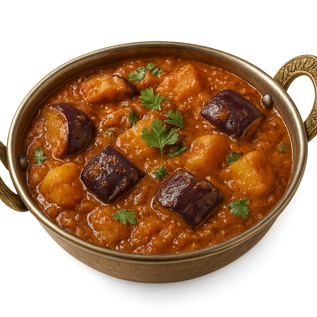 Spiced eggplant and potatoes cooked in a flavorful blend of aromatic Indian spices and herbs.
