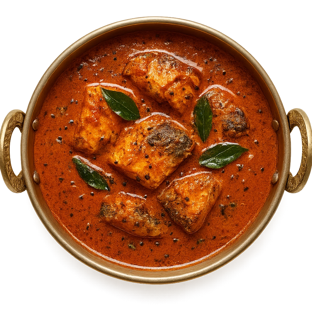 Spicy Madras curry with tender fish simmered in tangy tomato and aromatic South Indian spices.