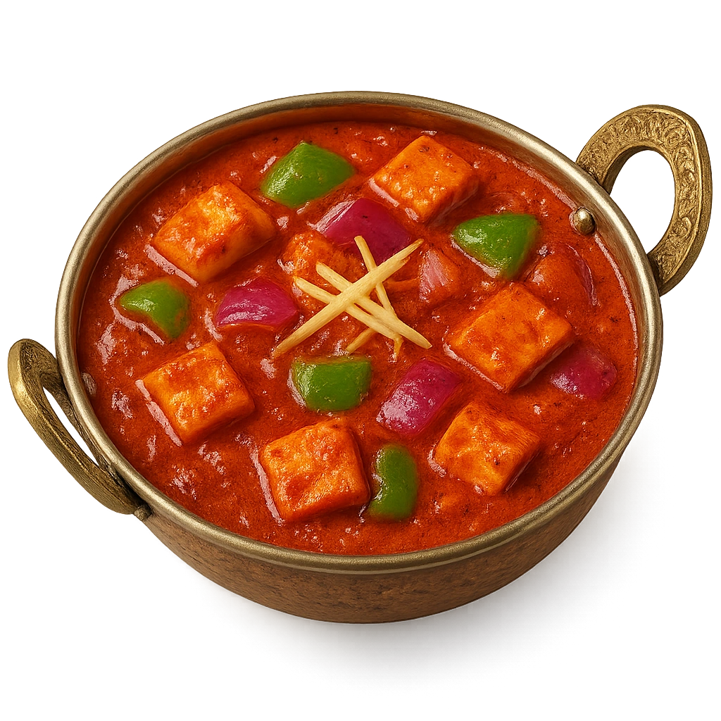 Spicy cottage cheese cubes cooked with onions, tomatoes, and bold Indian spices in a rich kadai gravy.