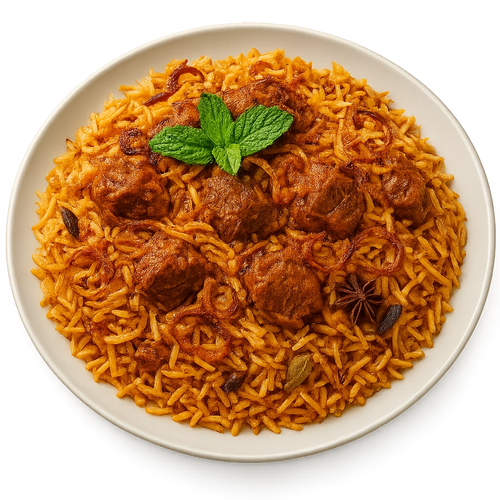 Fragrant basmati rice cooked with tender lamb, aromatic spices, and fresh herbs for a rich, flavorful experience.