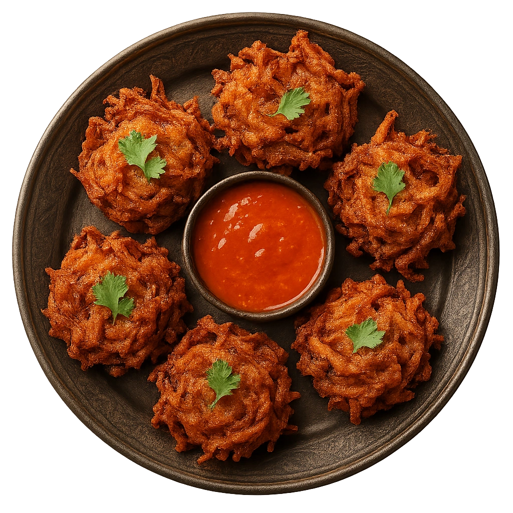 Crispy golden onion fritters seasoned with spices, perfect for a flavorful and crunchy snack.