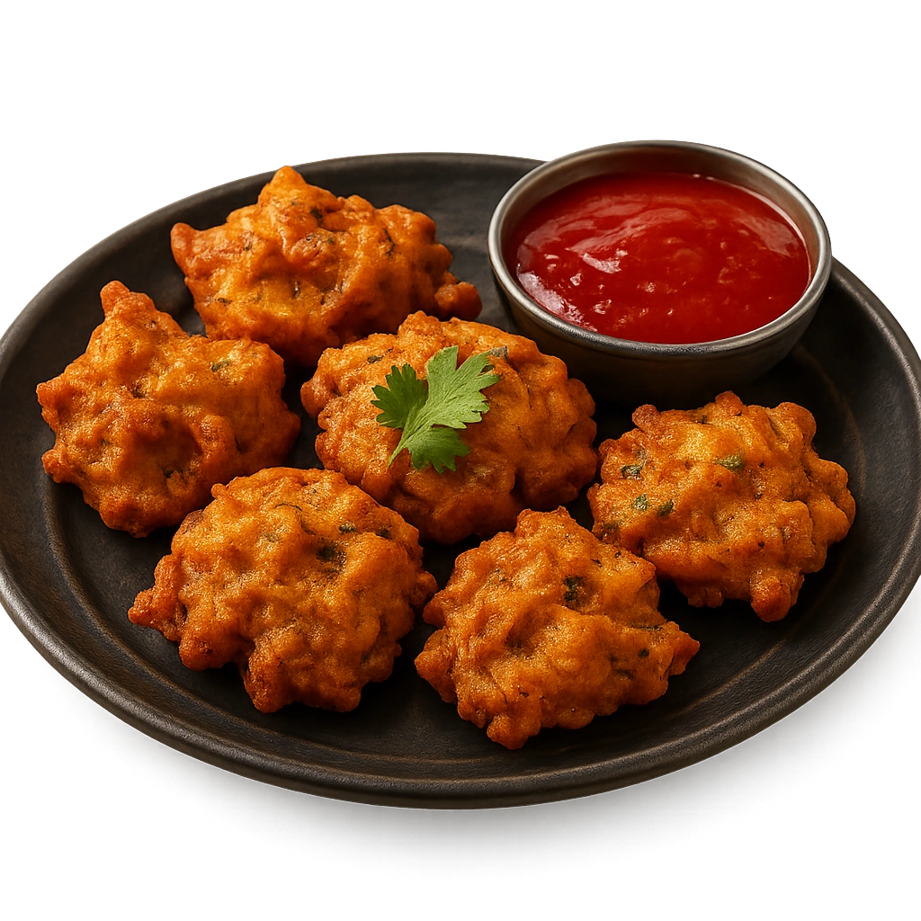 Crispy, golden-fried vegetable pakoras seasoned with aromatic spices for a flavorful bite.